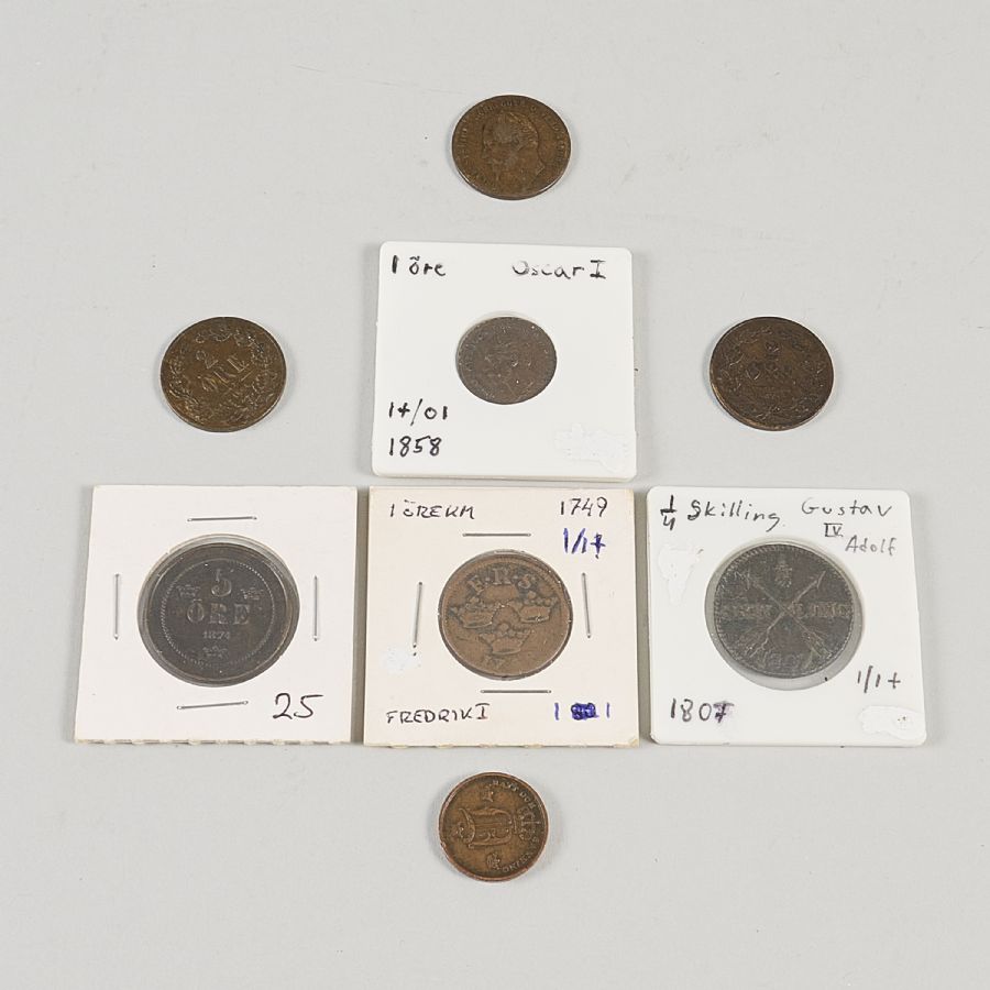 8 st, modell äldre, bland annat 1 öre Fredrik I & 1 öre Oscar I