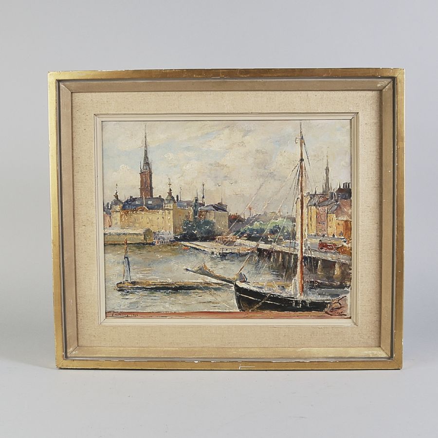 Oljemålning, Signerad, daterad 1946. Olja på pannå, 32x40cm, yttermått inklusive ram: 47x56cm