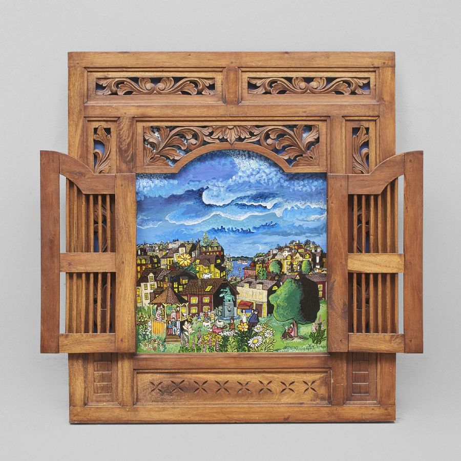 Bengt Elde (1939-2015), Sweden. Stadsmotiv med figurer, Inramad med fönsterluckor. Signed. Oil on panel, outer dimensions including frame: 90x80 cm,
