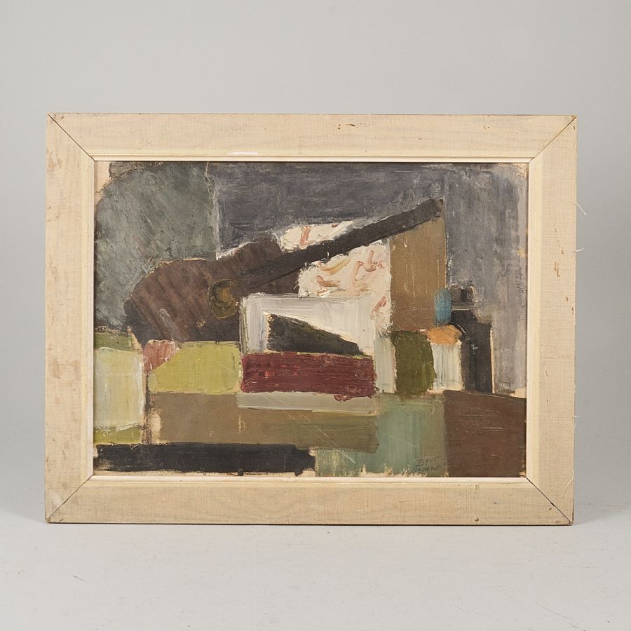 Oljemålning, Komposition med gitarr. Signerad. Olja på pannå, 34x47 cm, yttermått inklusive ram: 45x58 cm