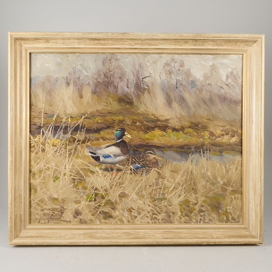Inga Törner. Signerad, daterad 1947, "Gräsänder". Olja på duk, 53x65 cm, yttermått inklusive ram: 64x77 cm