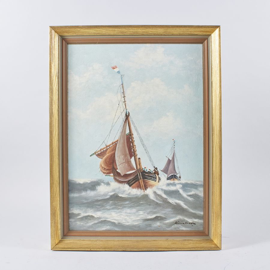 signerad, båt. Olja på duk, 54x39cm, yttermått inklusive ram: 64x49cm