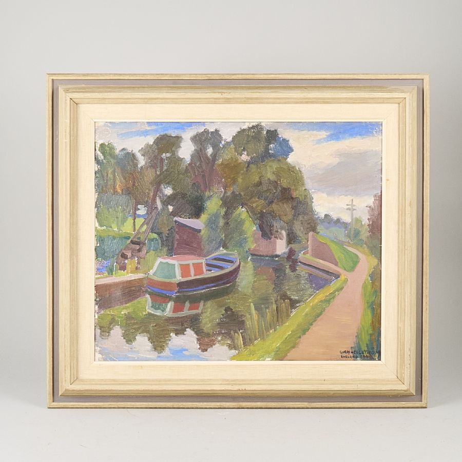 Oljemålning, Signerad, daterad 1948, Kanalbåt, England. Olja på duk, 45x54 cm, yttermått inklusive ram: 64x72 cm