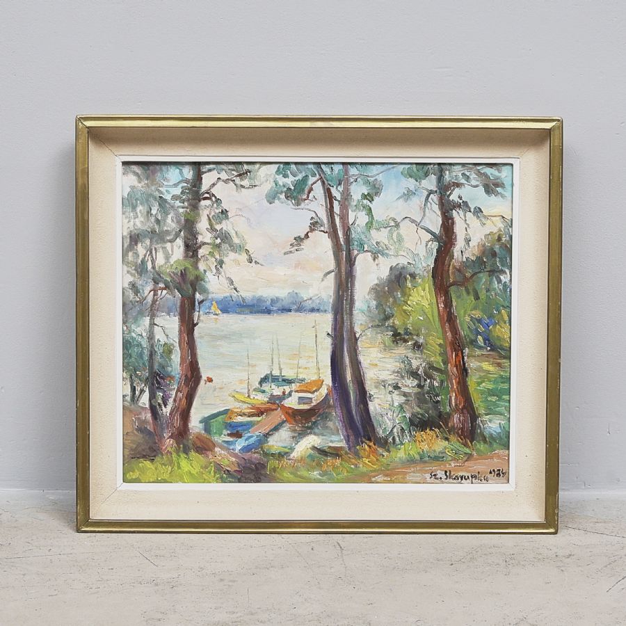 Szczepan Skorupka. Signerad, daterad 1984, båtbrygga. Olja på duk, 55x64 cm, yttermått inklusive ram: 67x78 cm
