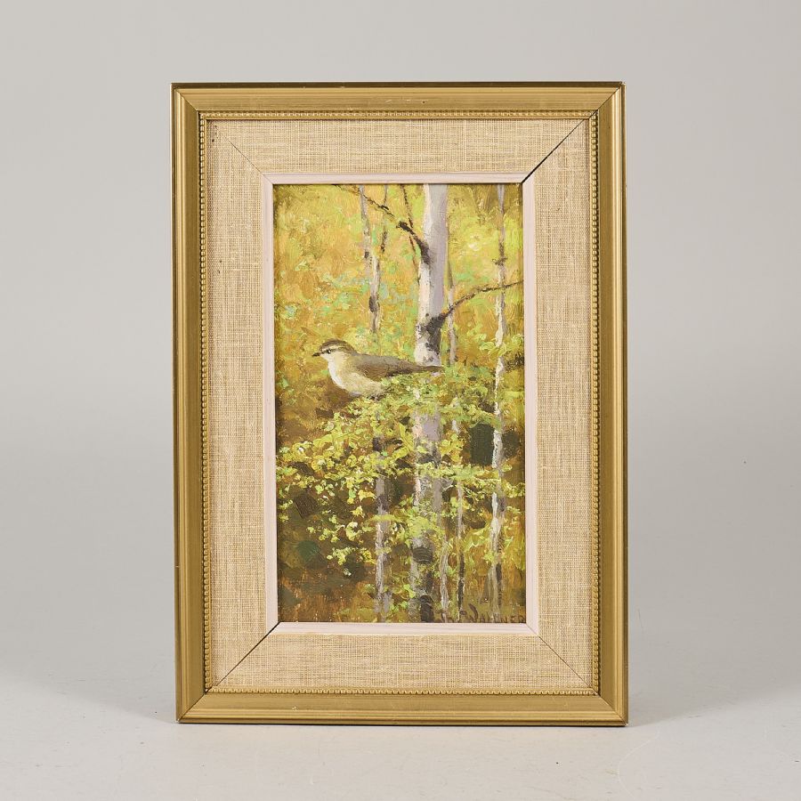 Oljemålning, Signerad, fåglar. Olja på pannå, 22x12cm, yttermått inklusive ram: 32x23cm