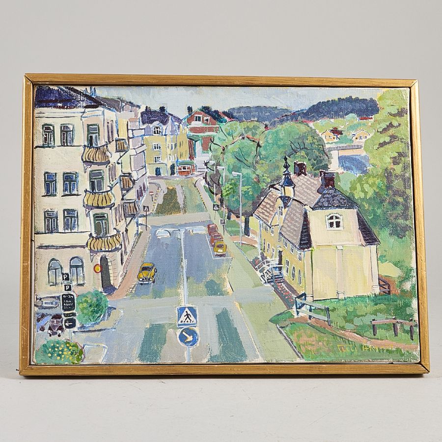 Titti Åhs (1922-2014), Motiv från Södertälje. Signerad, daterad -79. Olja på duk, yttermått inklusive ram: 26x35 cm