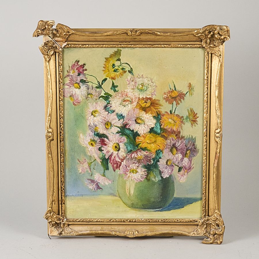 Oidentifierad konstnär. Otydlig signatur, stilleben. Olja på pannå, 45x36 cm, yttermått inklusive ram: 56x46