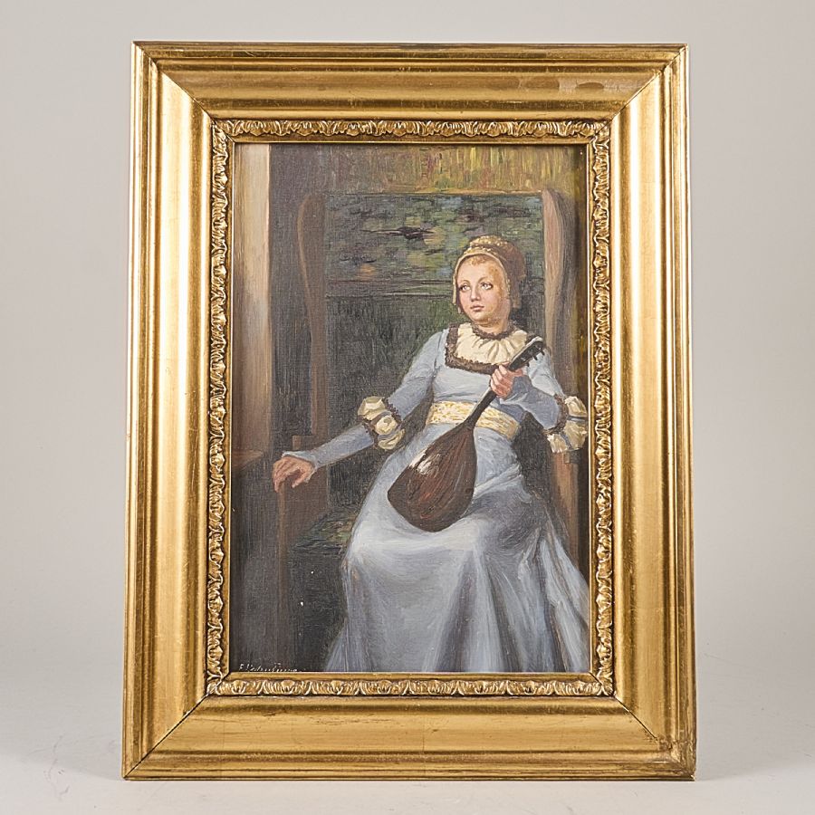 Oidentifierad konstnär. Signerad, flicka med luta. Olja på duk, 40X26 cm, yttermått inklusive ram: 55X42 cm