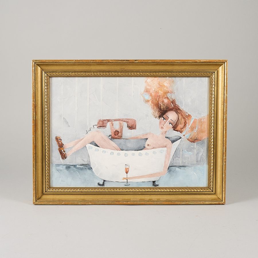 Oidentifierad konstnär. Signerad, kvinna i badkar. Olja på duk, 28x40 cm, yttermått inklusive ram: 36x48 cm