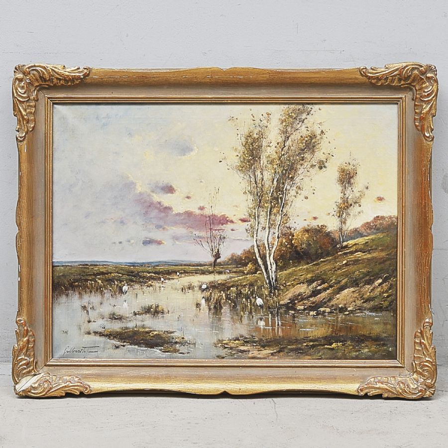 Oidentifierad konstnär. Signerad, vattendrag med storkar. Olja på duk, 58x78 cm, yttermått inklusive ram: 76x96 cm