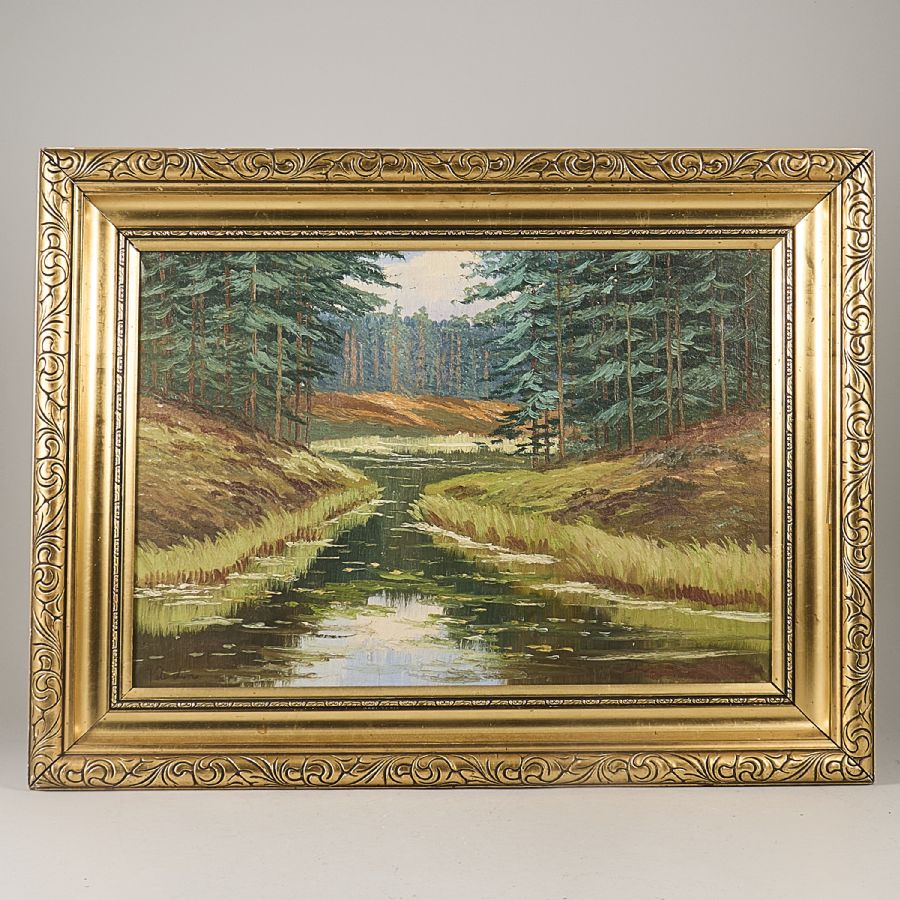 unidentified artist. Signerad Valentin, Landskap med vattendrag. Oil on canvas, 43x63 cm, outer dimensions including frame: 62x82, wear.