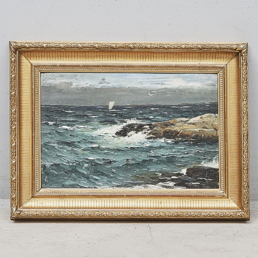 Oidentifierad konstnär. 1800-tal, Kustlandskap med segelbåt, ej signerad, uppfodrad duk. Olja på duk, 37x58 cm, yttermått inklusive ram: 57x76 cm