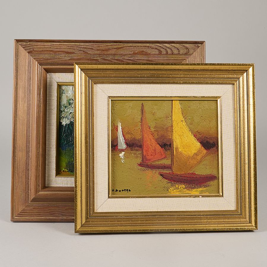 OIL PAINTINGS, 2 st, Eka & segelbåtar. Signerade. Olja på pannå, 15x17 cm, yttermått inklusive ram: 26x28 - 32x30