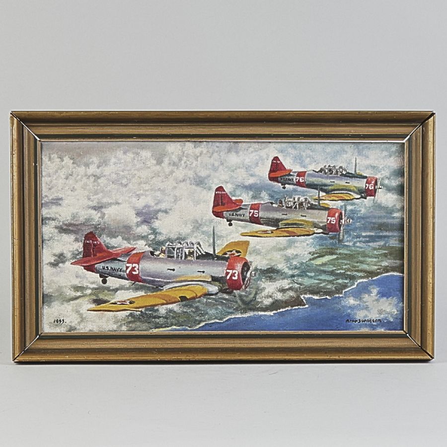 Arne Svensson. Signerad, flygplan. Olja på pannå, 27x51cm, yttermått inklusive ram: 35x60cm