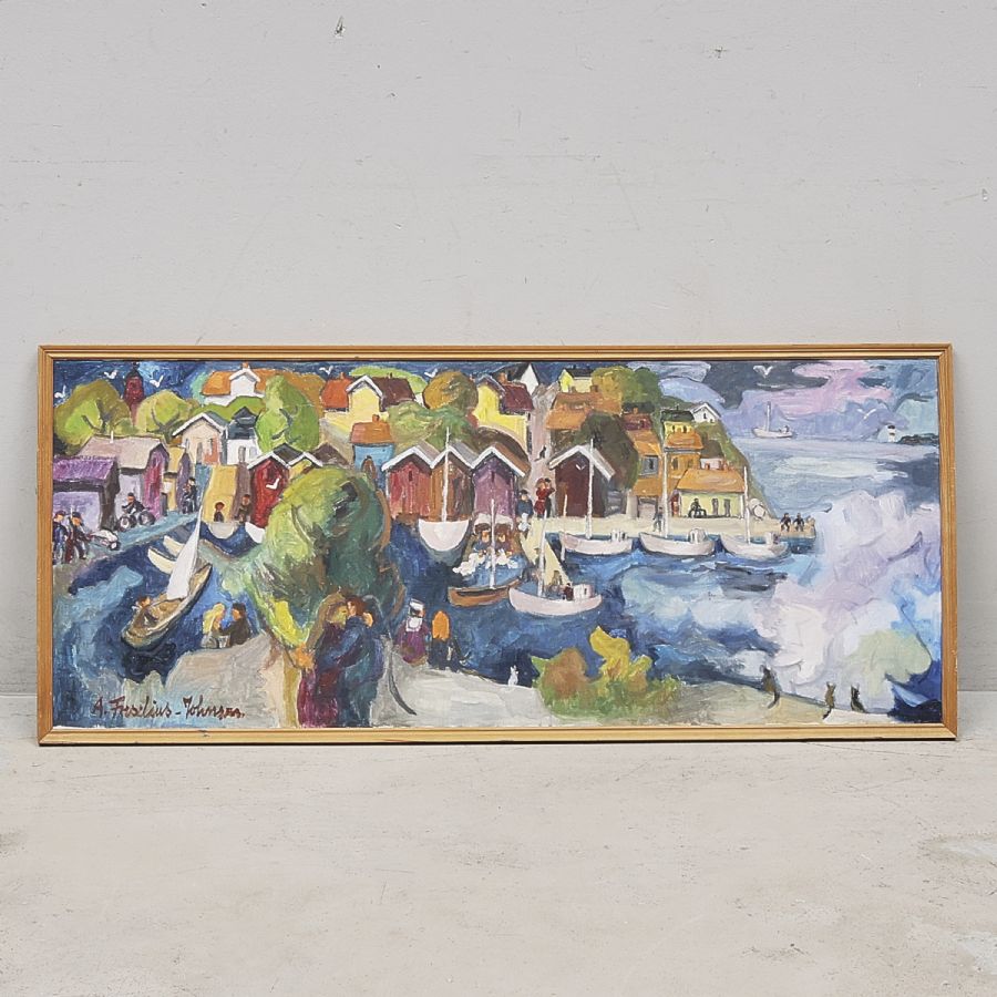 Astrid Forselius-Johnson (1913-2003), Sweden. Signed, hamnen i Öregrund. Oil on canvas, 120x48 cm, outer dimensions including frame: 53x123 cm,