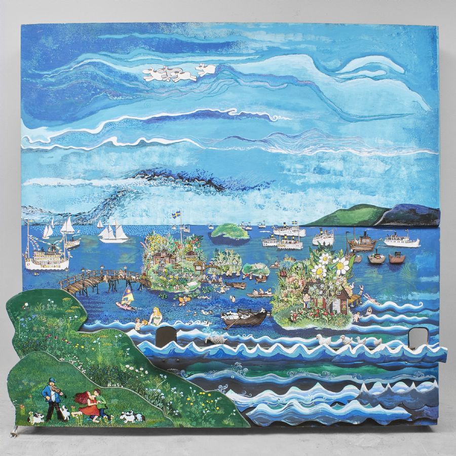 Bengt Elde (1939-2015), Sweden, attributed. Skärgårdsidyll, mekaniskt rörliga ankor. No signature. Reliefdekor / collage, Oil on panel, outer dimensions including frame: 200x210 cm.