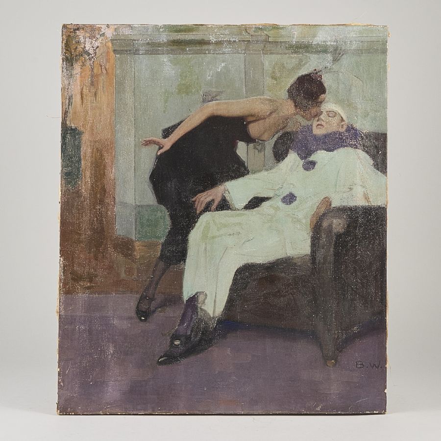 Oljemålning, Sovande Pierrot. Signerad BW, Olja på duk, 60x51 cm. Oramad