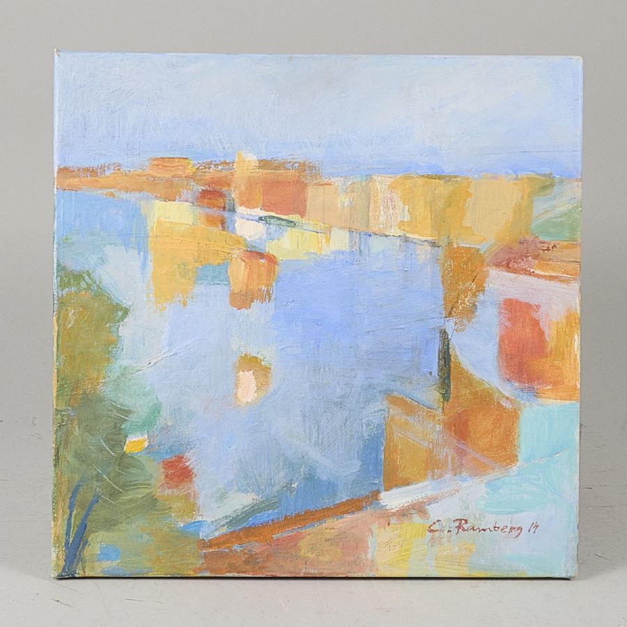 Caroline Ramberg. Signerad, daterad 14, Stockholm. Olja på duk, 35x35, oramad