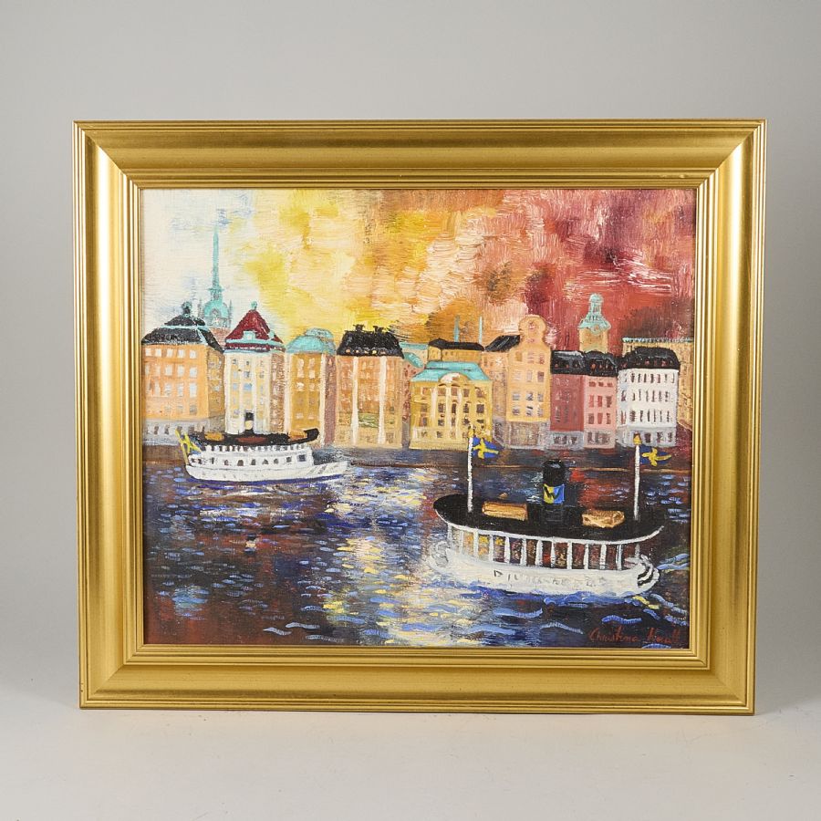 Oljemålning, Signerad, "Skeppsbron". Olja på duk, 45x54 cm, yttermått inklusive ram: 59x68 cm
