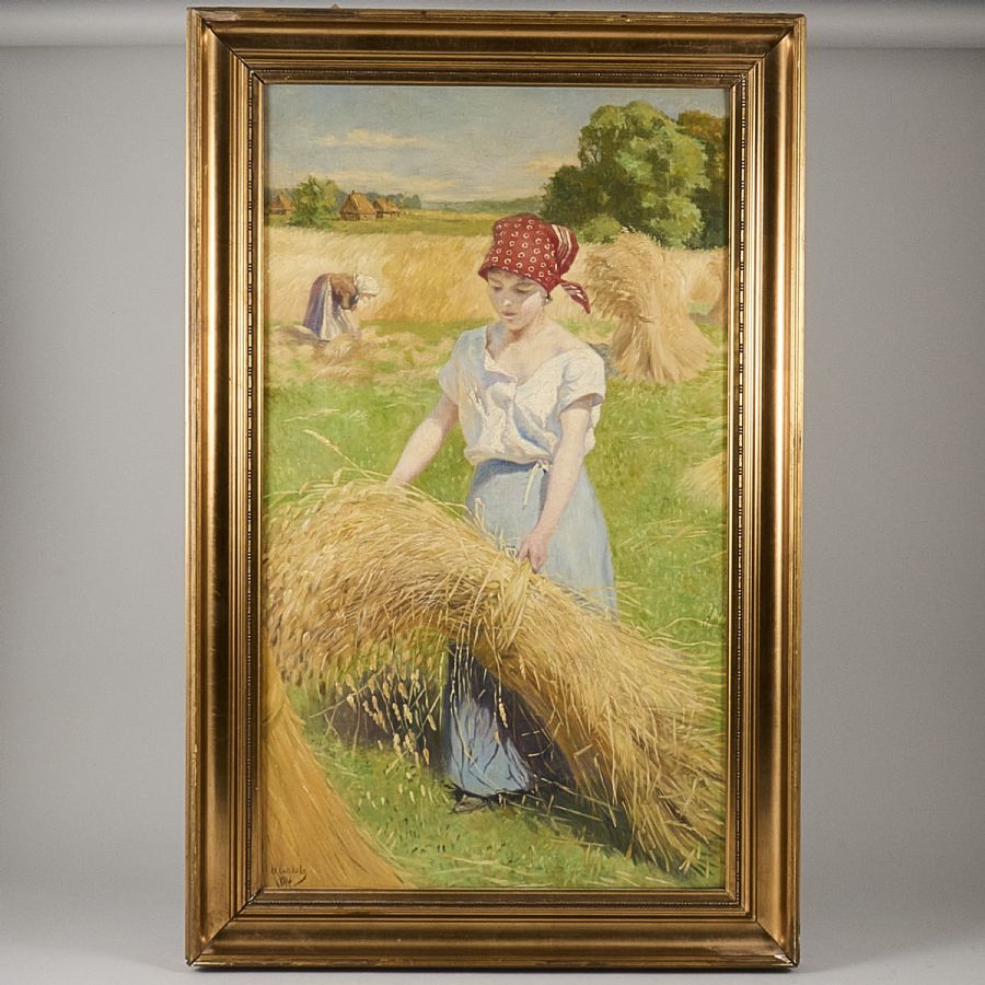 Feodor Sychkov, Skördande ung flicka. Signerad, daterad 1916. Olja på duk, 81x48 cm, yttermått inklusive ram: 94x61 cm