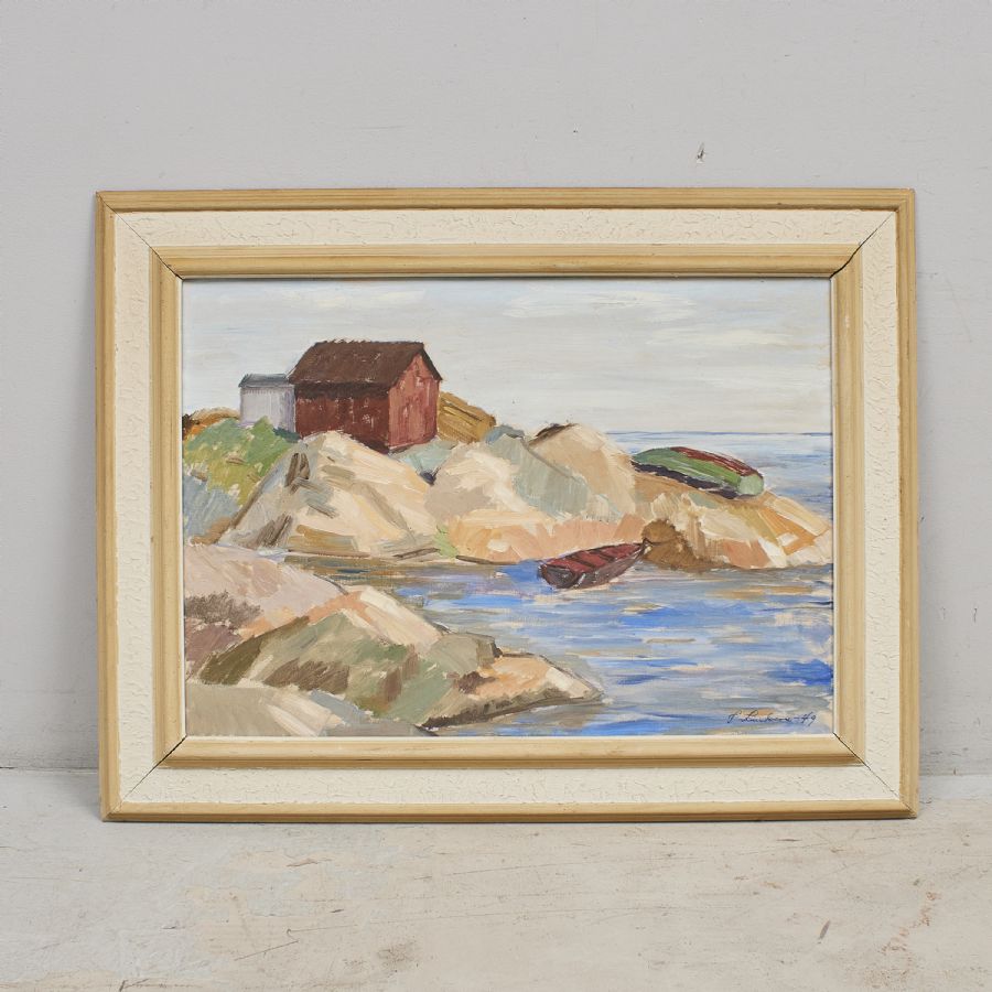 I Knutsson. Signerad, daterad - 49, skärgårdsmotiv. Olja på duk, 65x92 cm, yttermått inklusive ram: 91x116