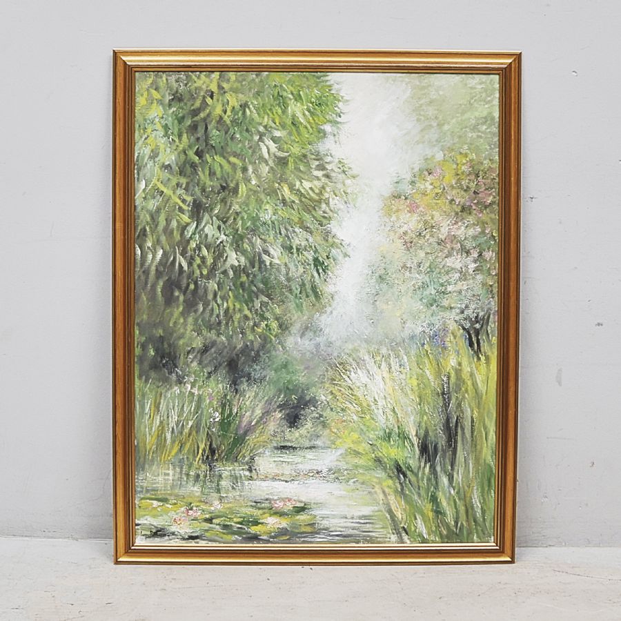 Oljemålning, "Motiv fån Monets trädgård". Signerad, daterad -94. Olja på duk, 114x88 cm, yttermått inklusive ram: 126x99 cm