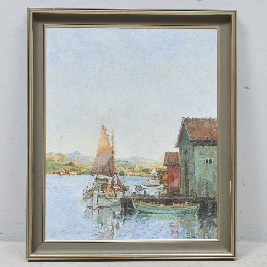 Oljemålning, Signerad, Fiskeläge. Olja på duk, 75x60 cm, yttermått inklusive ram: 88x74 cm