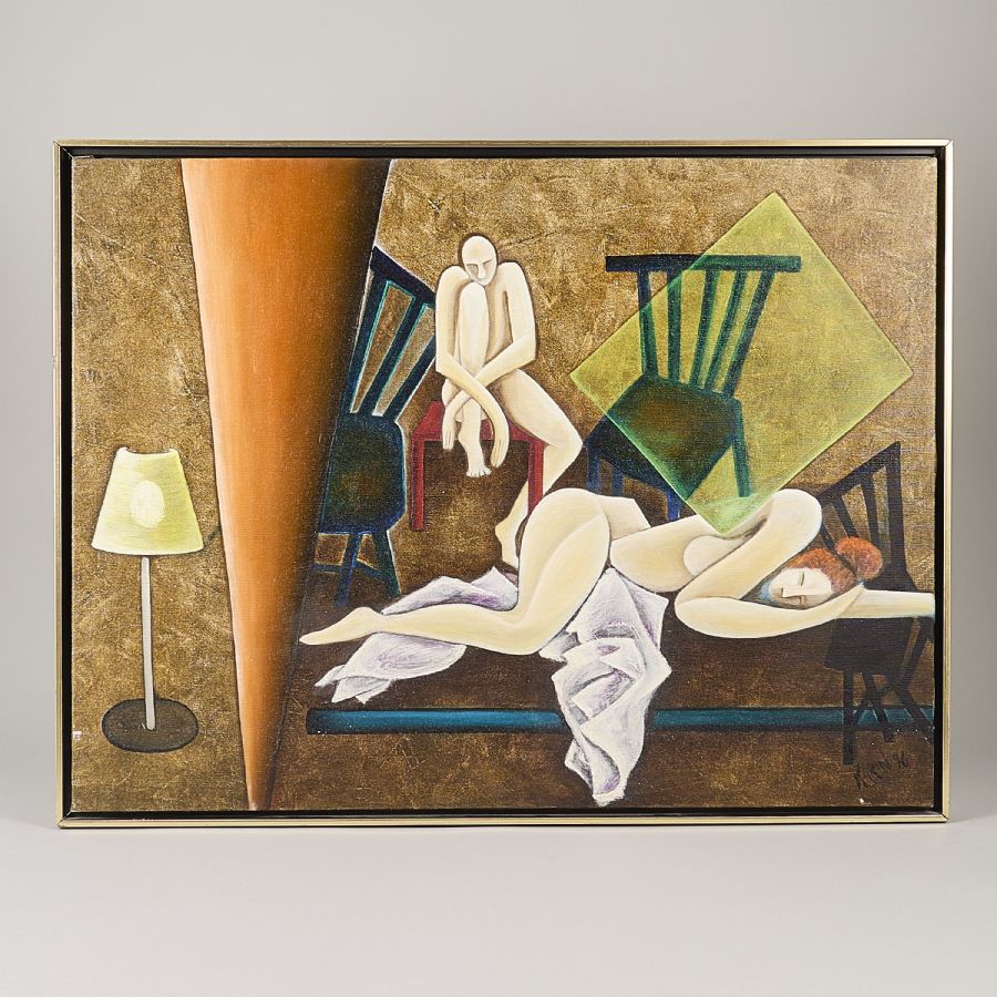 Karin Ängehov, "Efteråt". Signerad, daterad 1996, utställd på Liljevalchs. Olja på duk, 60x80 cm, yttermått inklusive ram: 63x83 cm