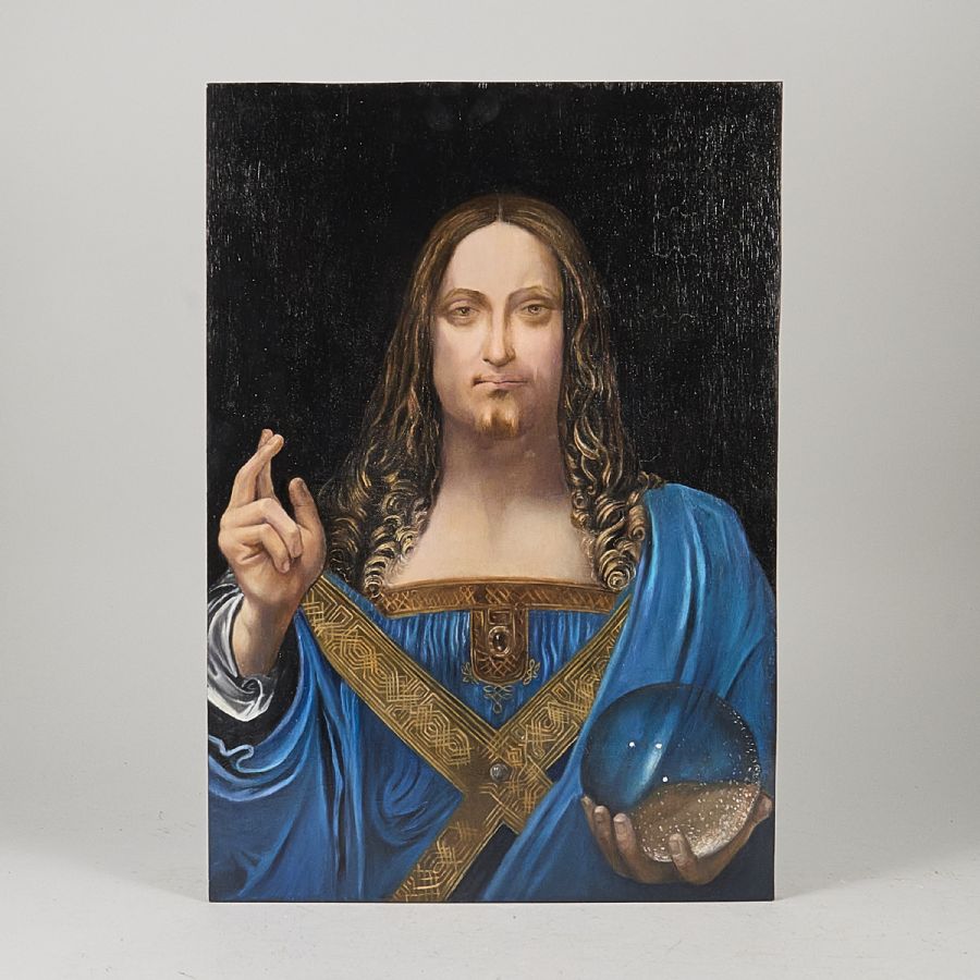 Kopia Efter Da Vinci, Salvator Mundi, ej. Signed. Oil on panel, 66x46,