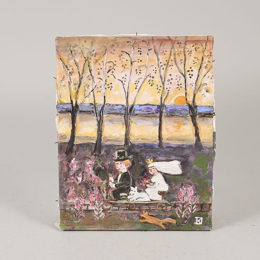 Oljemålning, Monogramsignerad, "Brudfärd på räls". Olja på duk, 27x21,5, oramad
