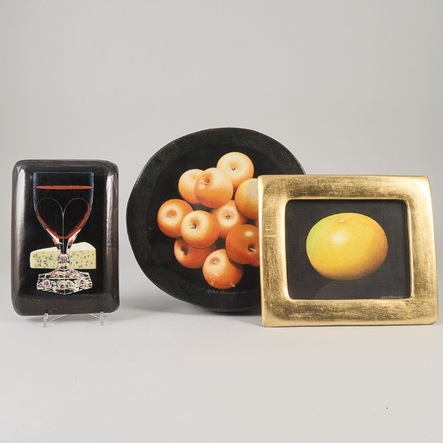 3 st, Lars Tärning (1945-2025), Sverige. Signerad, frukter/vin & ost. Olja på pannå, 23x15-22x26-28x28 cm, oramad