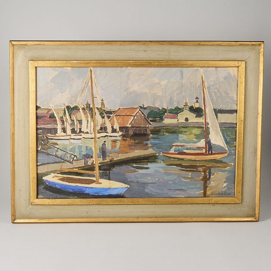 Lennart Örnebäck, Hamnmotiv. Signerad. Olja på duk, 44x68 cm, yttermått inklusive ram: 62x86 cm