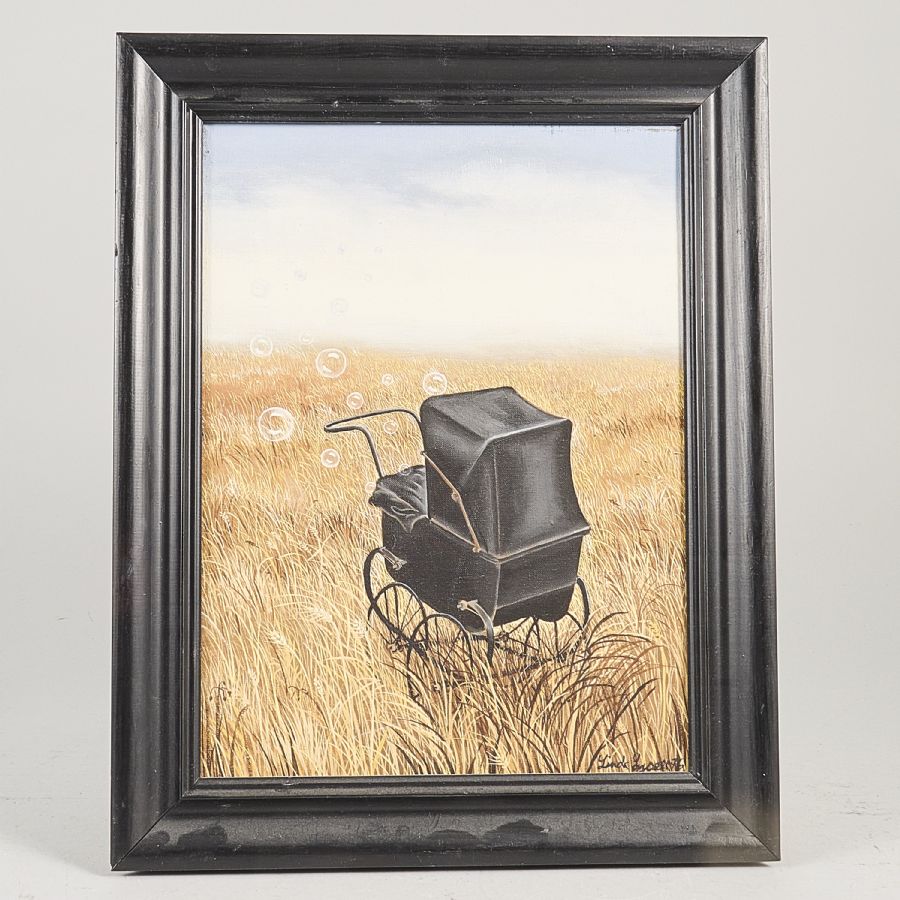 Linda Lysell (f. 1947), Sverige. Signerad, daterad -76, Barnvagn. Olja på duk, 33x24 cm, yttermått inklusive ram: 42x33