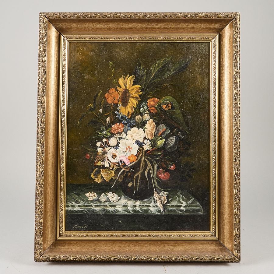Maria Sas, Signerad, blomsterstilleben. Olja på pannå, 40x30 cm, yttermått inklusive ram: 52x43 cm