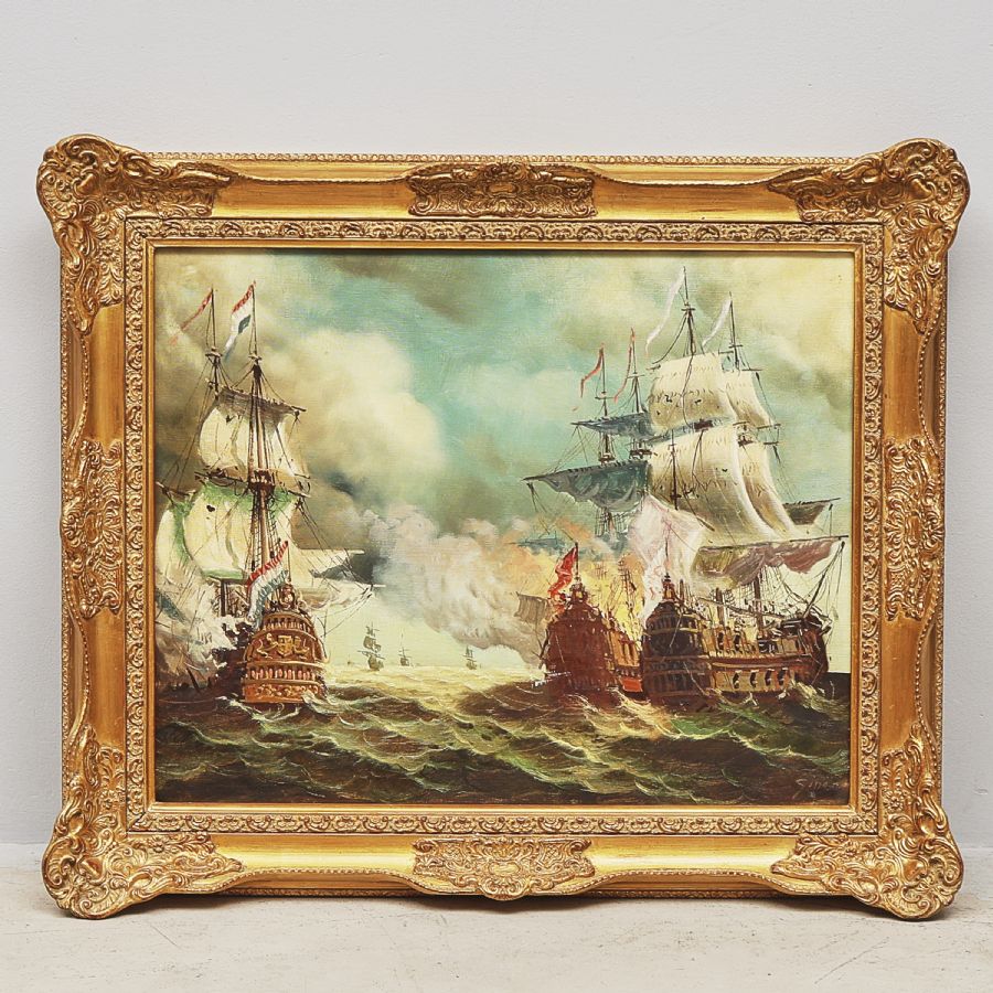 marin, sjöslag, Oidentifierad konstnär. Signerad. Olja på duk, 63x80 cm, yttermått inklusive ram: 87x104