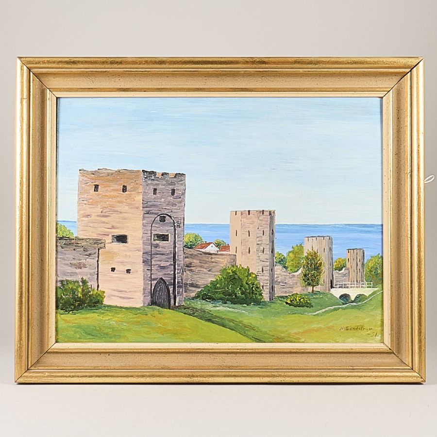 N. Sandström. Signerad, daterad - 51, Visby ringmur. Olja på pannå, 45x60 cm, yttermått inklusive ram: 59x74