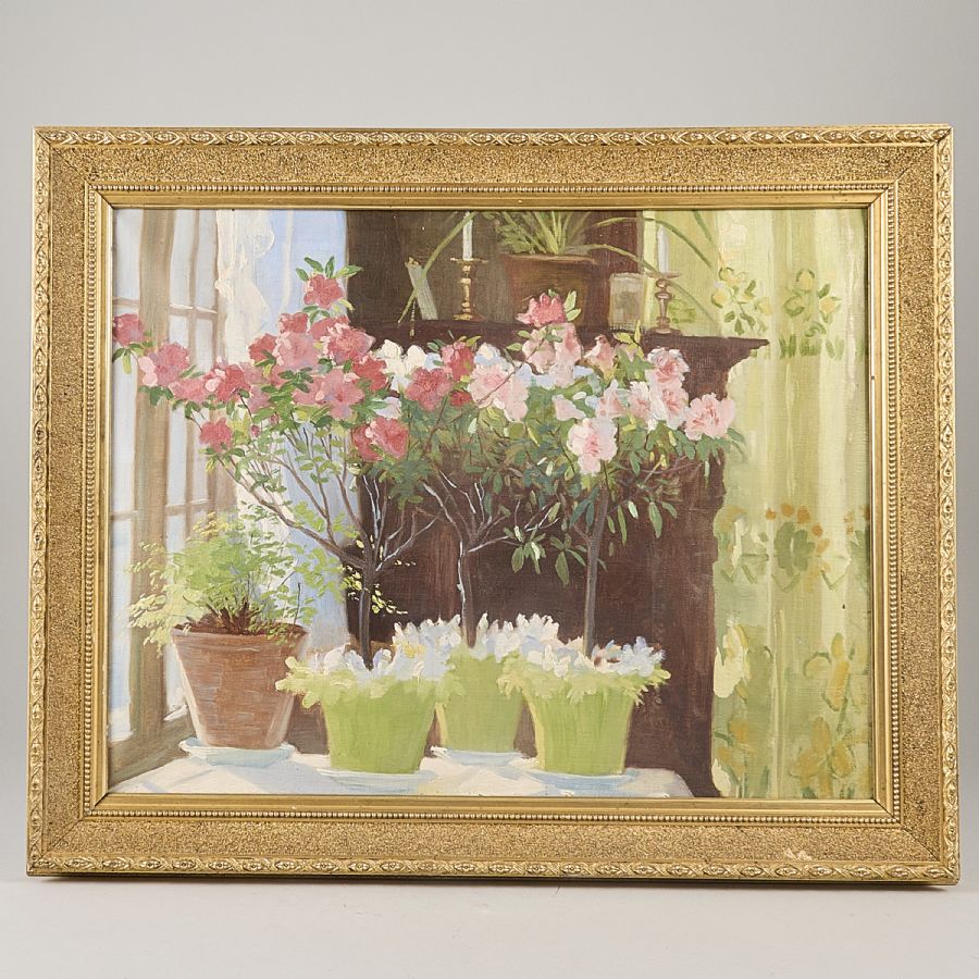 Oidentifierad konstnär, ej signerad, krukväxter. Olja på duk, 44x56, yttermått inklusive ram: 57x69