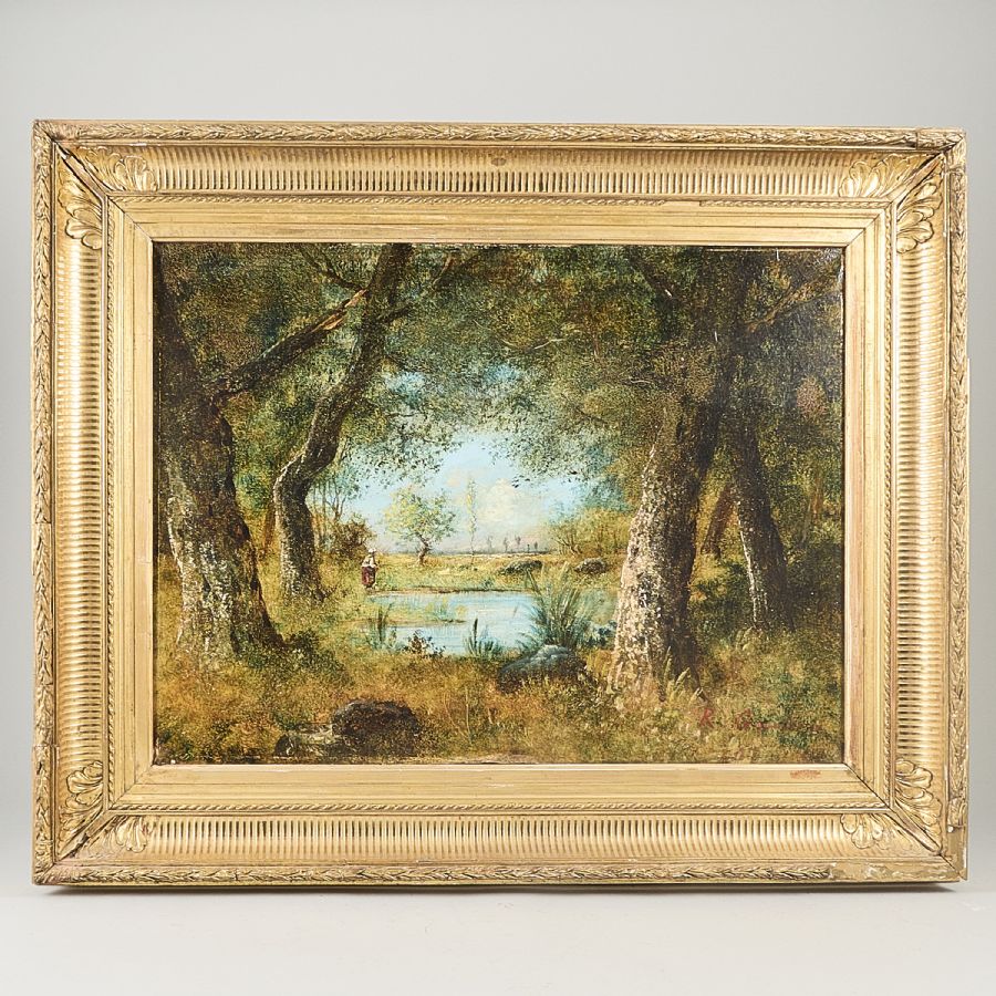 Oidentifierad konstnär. Omkring 1900, kvinna vid damm. Signerad. Olja på duk, 48x64 cm, yttermått inklusive ram: 70x86 cm