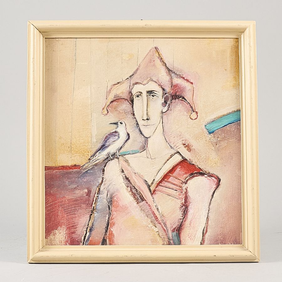 Oidentifierad konstnär. Påskrift a tergo, clown med fågel. Olja på pannå, 33x31 cm, yttermått inklusive ram: 38x36 cm