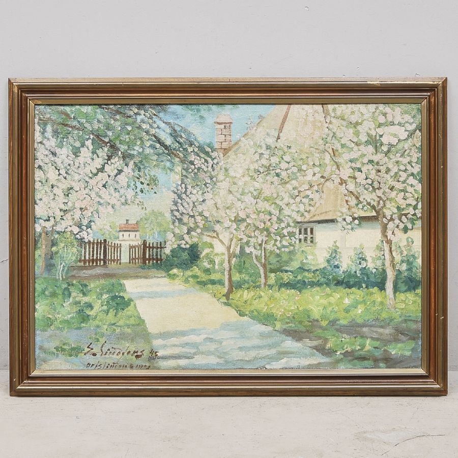 Oidentifierad konstnär. Signerad E Lindfors, blommande fruktträd. Olja på duk, 84x123, yttermått inklusive ram: 101x140 cm
