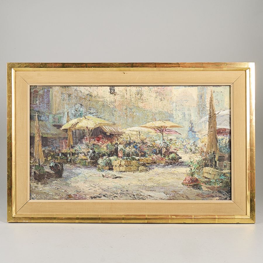 Oidentifierad konstnär, Signerad, torghandel. Olja på duk, 37x64 cm, yttermått inklusive ram: 51x78