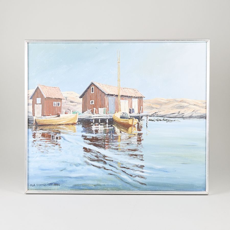 Ola Stenqvist, fiskeläge. Signerad, daterad 1992. Olja på duk, 53x64 cm, yttermått inklusive ram: 56x67