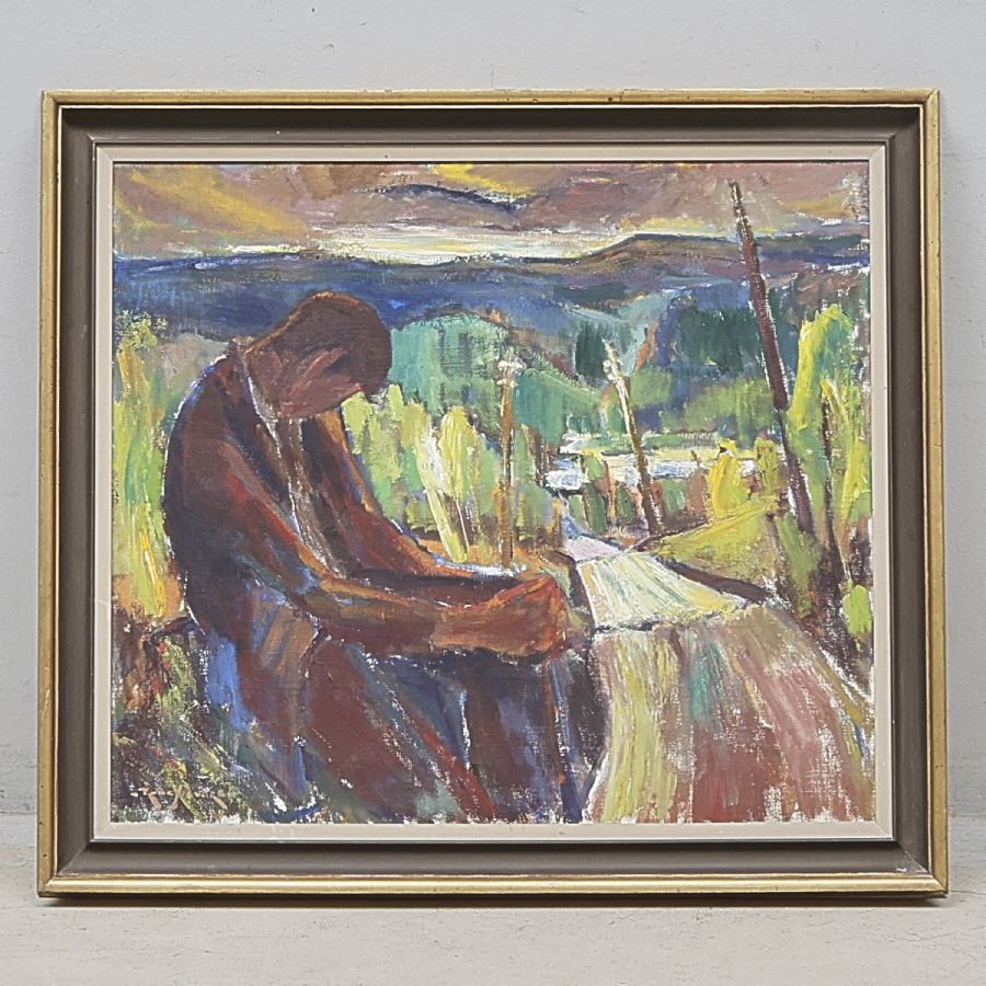 Oljemålning, Sittand man vid vägkant. Signerad. Olja på duk, 68x77 cm, yttermått inklusive ram: 83x93 cm