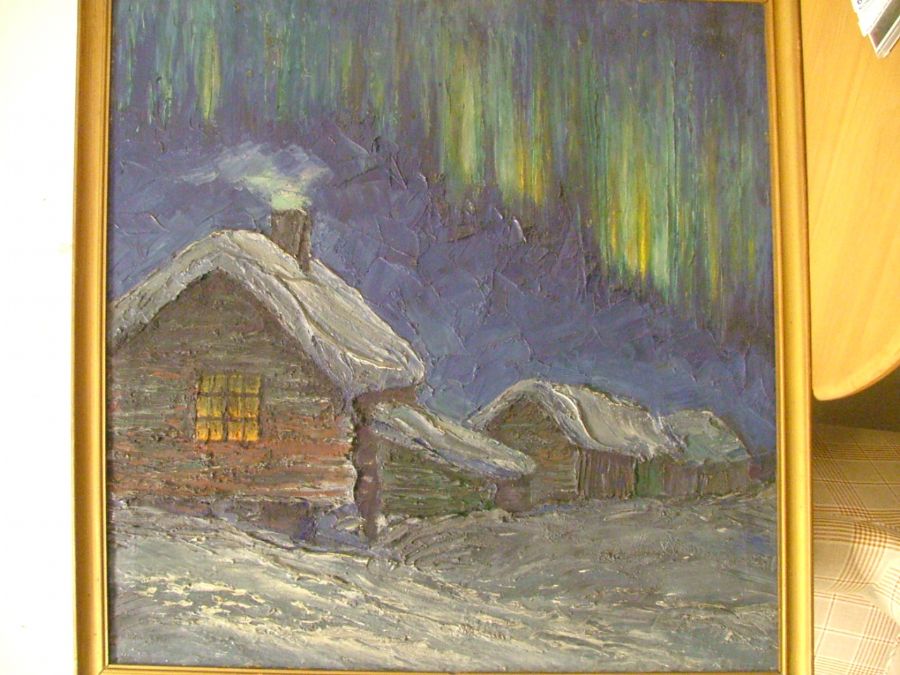 Oljemålning, Sign Hertzhoff, Stuga i vinterlandskap, 75x73
