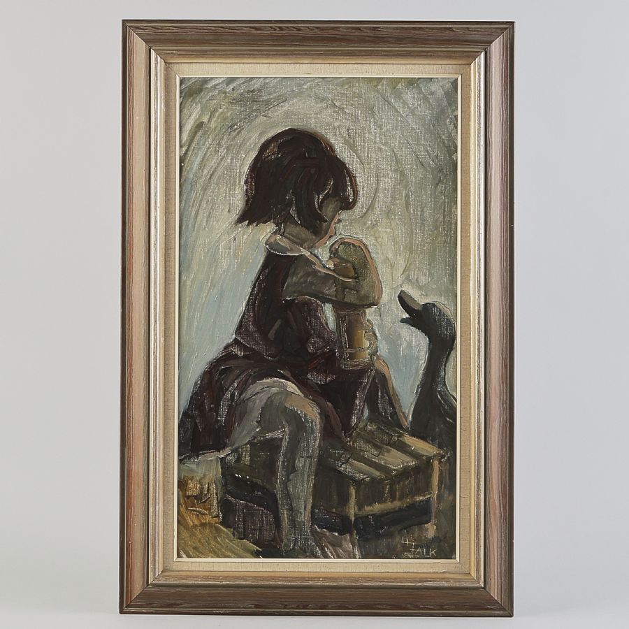 signerad H Falk, flicka & gås. Olja på duk, 64x37 cm, yttermått inklusive ram: 79x53 cm
