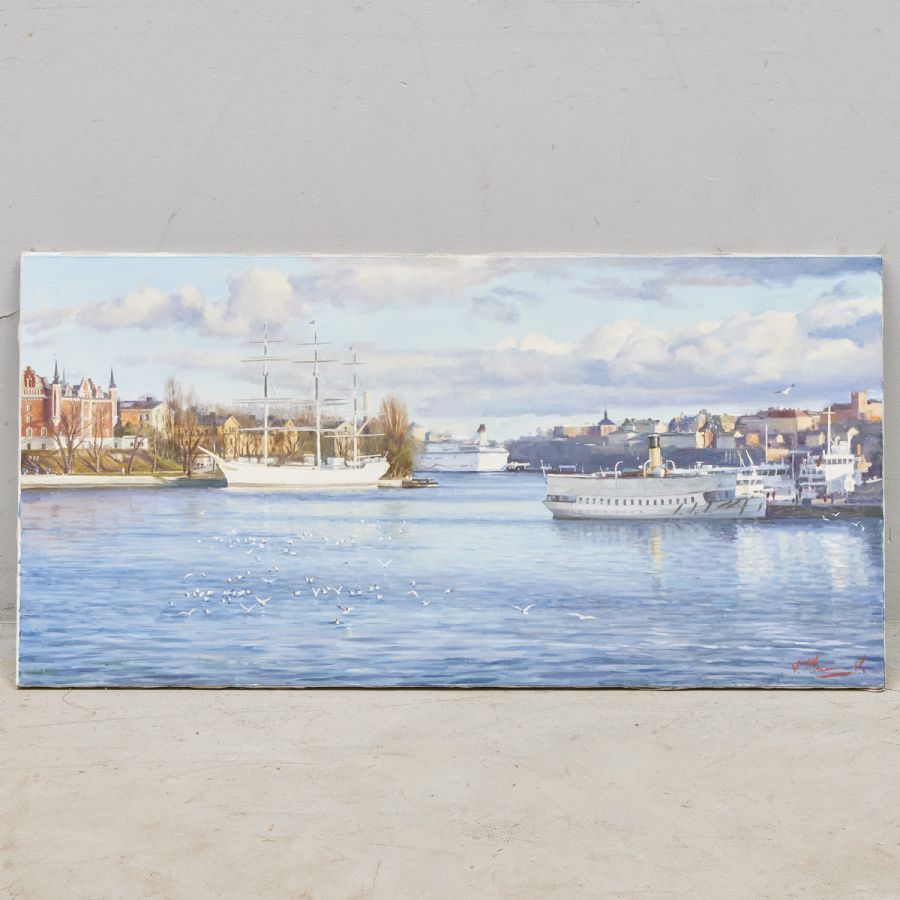 Oljemålning, Slava Kliuchnikov (f. 1956, Signerad, Stockholms inlopp. Olja på duk, 50x100, oramad