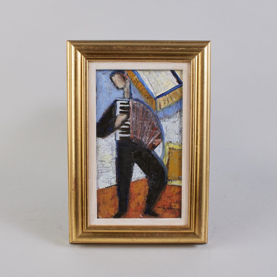 Oljemålning, Signerad. Olja på duk, spelman, 13x23 cm, yttermått inklusive ram: 33x23 cm