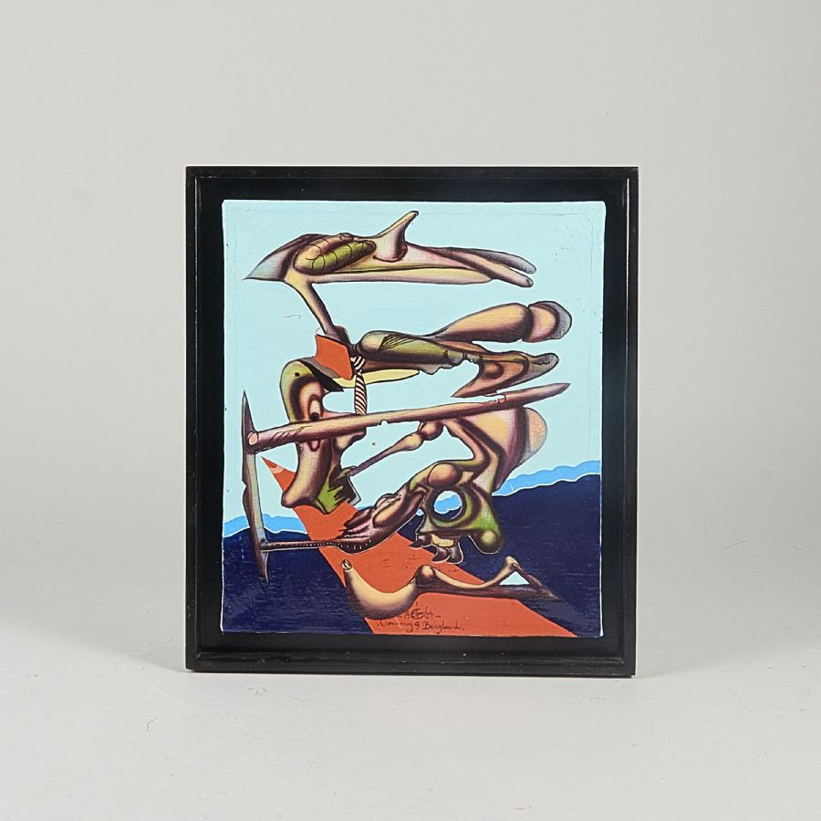 Tommy Berglund, "Atom Tango". Signerad, daterad 1981. Olja på duk, 32x28 cm, yttermått inklusive ram: 37x33 cm