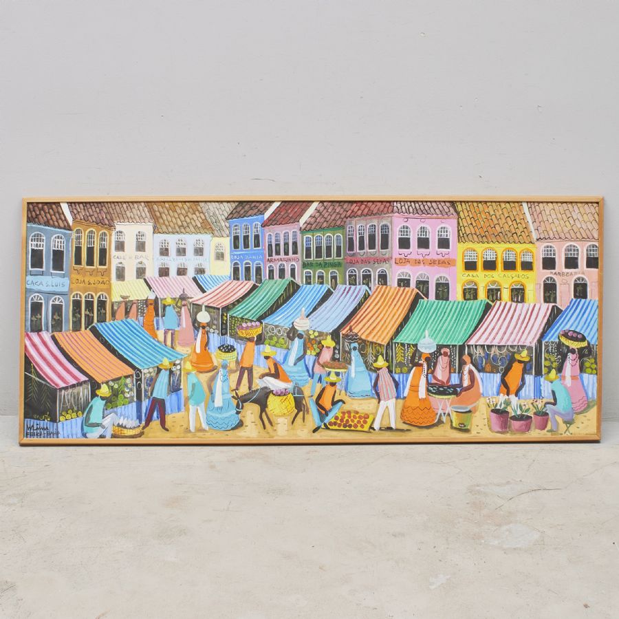 Walter Lima. Signerad, torgscen Sydamerika. Olja på duk, yttermått inklusive ram: 74x177 cm