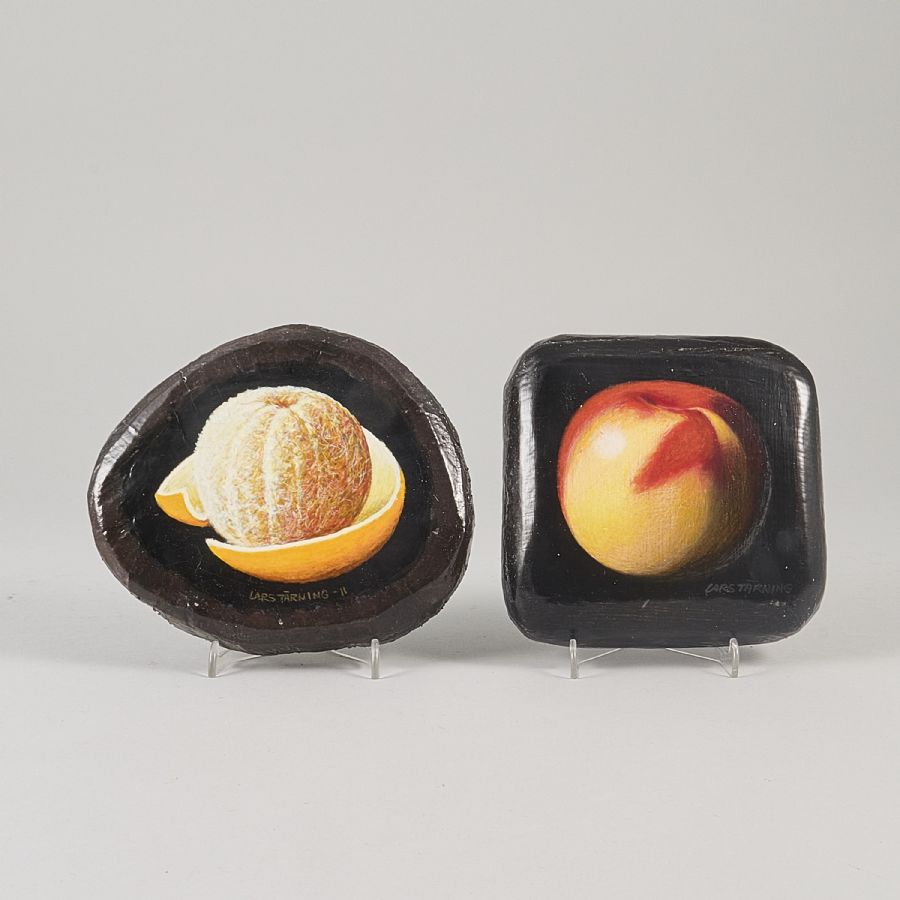 2 st, Lars Tärning (1945-2025), Sverige. Signerad, Apelsin/Äpple. Olja på pannå, 16-x15-15x18 cm, oramad